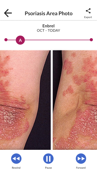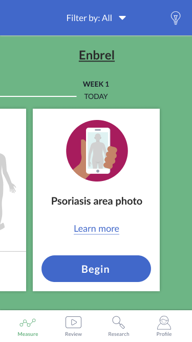 Frequent engagement with Psorcast allowed users to forecast their condition. The Review tab allowed users to view all of their activity history, and filter it by time ranges as well as medications and treatments. Activity was compressed into a timeline of sorts within each activity and upon engagement allowed users to view a .gif of their condition's progression. They could export their .gifs to share with their care team for treatment as well.