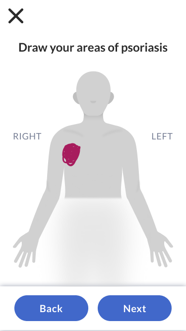 Employing established standards for measuring psoriasis coverage and severity, we created a digital assessment enabling users to visually draw their plaque coverage, thus determining the extent of their psoriasis. Post-activity, users receive a percentage output, with the added feature of tracking their progress over time to monitor the evolution of their condition.